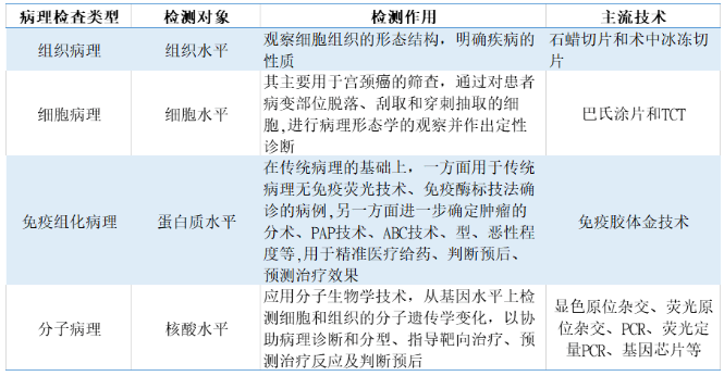 病理學根據發(fā)展階段的不同主要分為傳統(tǒng)病理技術(組織病理、細胞病理)、免疫組化病理和分子病理。傳統(tǒng)的組織病理建立在組織、細胞的水平上,可以通過病理醫(yī)師的顯微鏡診斷來判斷疾病的性質(炎癥性病變還是腫瘤型病變、良性腫瘤還是惡性腫瘤等);免疫組化病理建立在蛋白質水平上,可以進一步判斷腫瘤的組織來源、原發(fā)部位、病理分型、殘留邊緣癌細胞等,除了診斷作用以外還具有指導預后的作用;分子病理建立在核酸分子水平上,可以確定腫瘤的基因突變類型,用于后續(xù)靶向藥物的指導以實現(xiàn)精準醫(yī)療。