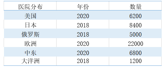 根據上圖所示,不完全統(tǒng)計表明2020年美國約有6200家醫(yī)院,歐洲約有22000家,中東約有6800家醫(yī)院,2018年日本有8400家醫(yī)院,大洋洲有1200家醫(yī)院,俄羅斯有5000家醫(yī)院。
