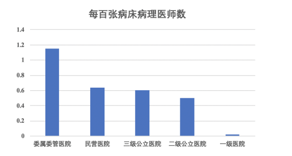 如上圖所示,其中委屬委管醫(yī)院每百張病床病理醫(yī)師數(shù)僅為1.15,三級公立醫(yī)院、二級公立醫(yī)院和民營醫(yī)院分別為0.60、0.50及0.64。根據最新發(fā)布的《2019年全國病理質量報告》顯示,在不同級別的醫(yī)院中,全國平均每百張病床病理醫(yī)師數(shù)量為0.55,病理醫(yī)師數(shù)量奇缺的狀況沒有改善,各省、自治區(qū)、直轄市均未達到2009年《病理科建設與管理指南(試行)》(以下簡稱《指南》)的最低要求(每百張床1-2名病理醫(yī)師)。