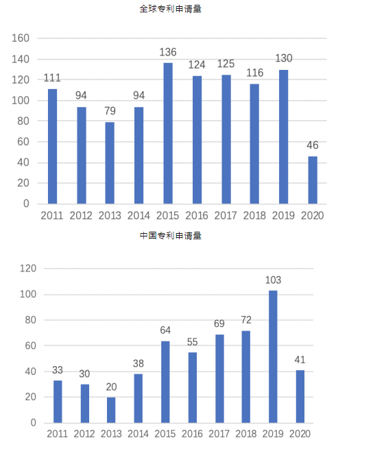 上圖所示為以“病理診斷”和“細胞病理”進行全球檢索得到的近10年的專利申請情況。從圖中可以看出,病理診斷領域近10年約有1055件專利申請(由于發(fā)明專利有18個月公開的滯后期,實用新型從申請到公開也需一段時間,因此2019年和2020年數(shù)據有所偏差),其中發(fā)明專利604件、實用新型專利179件。從圖2中可以看出,全中國病理診斷領域近10年約有525件專利申請(由于發(fā)明專利有18個月公開的滯后期,實用新型從申請到公開也需一段時間,因此2019年和2020年數(shù)據有所偏差)。